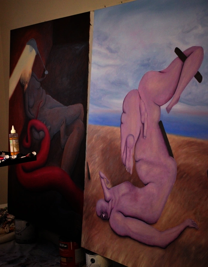 “The project focuses on how exploitation exists in our society, and on imagining alternatives to those systems. I’m making two groups of three paintings. The first three will explore a dystopian reality, highlighting the really terrible aspects of how our world works right now.