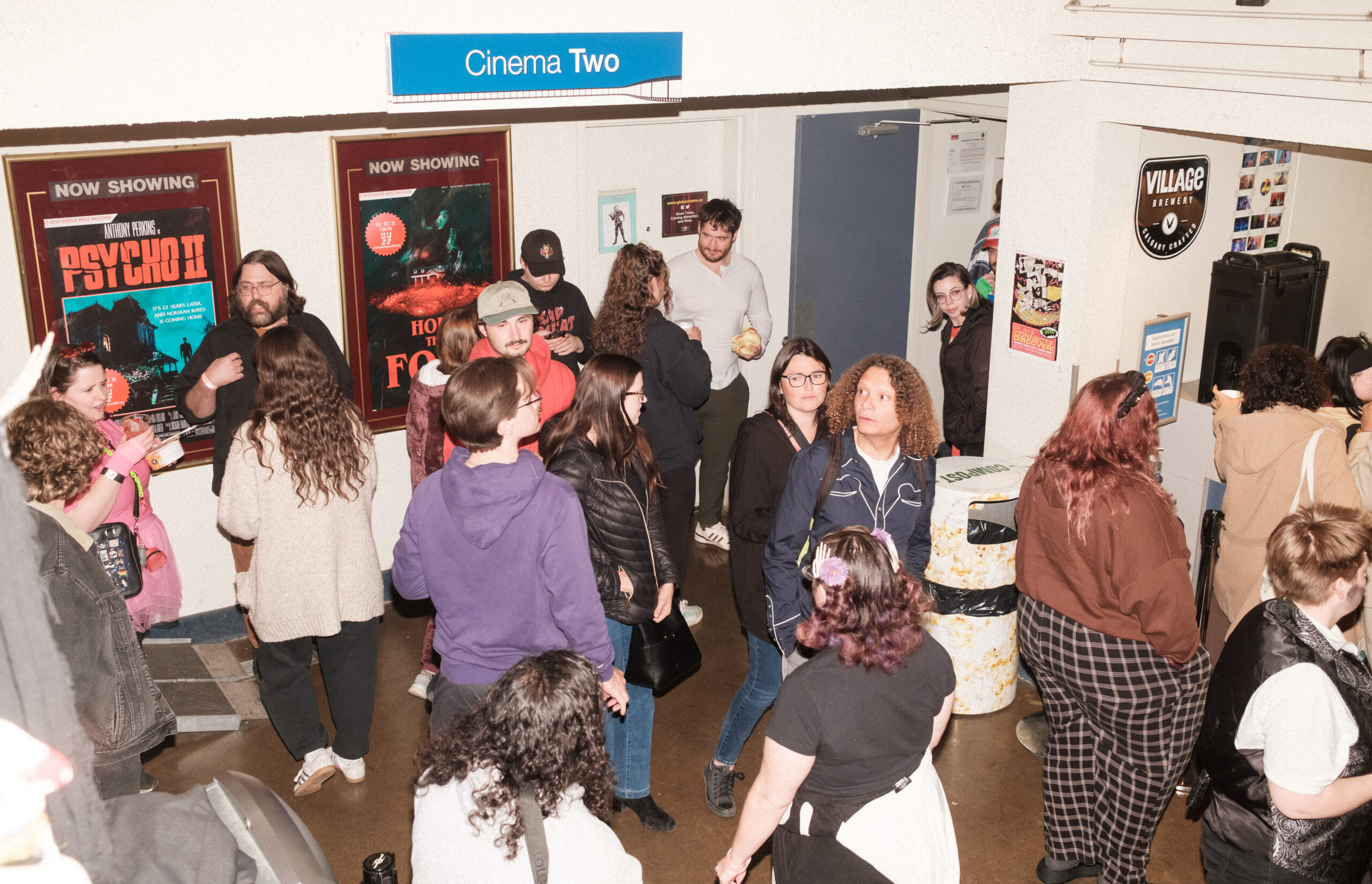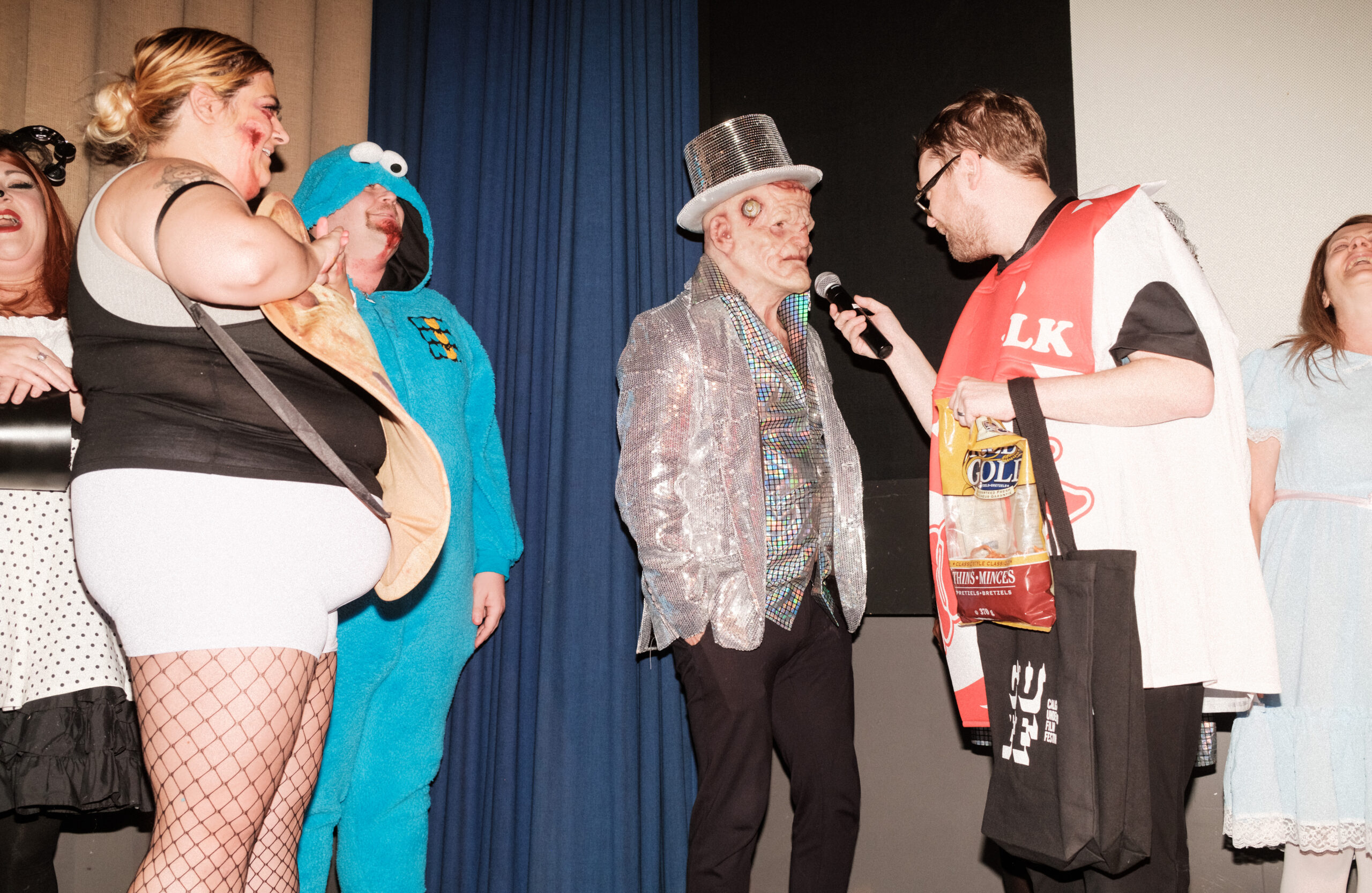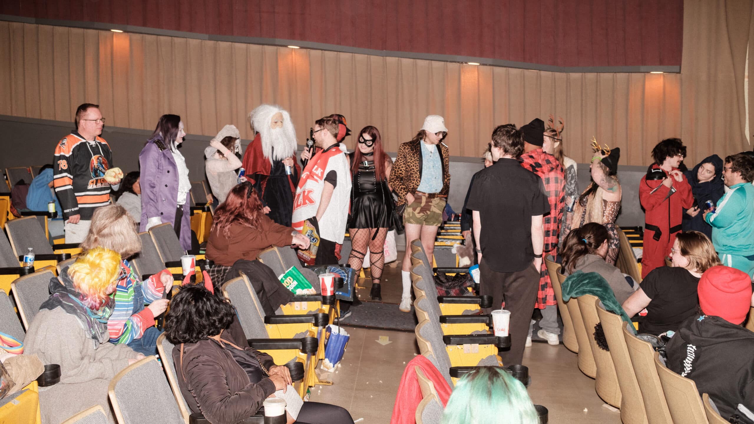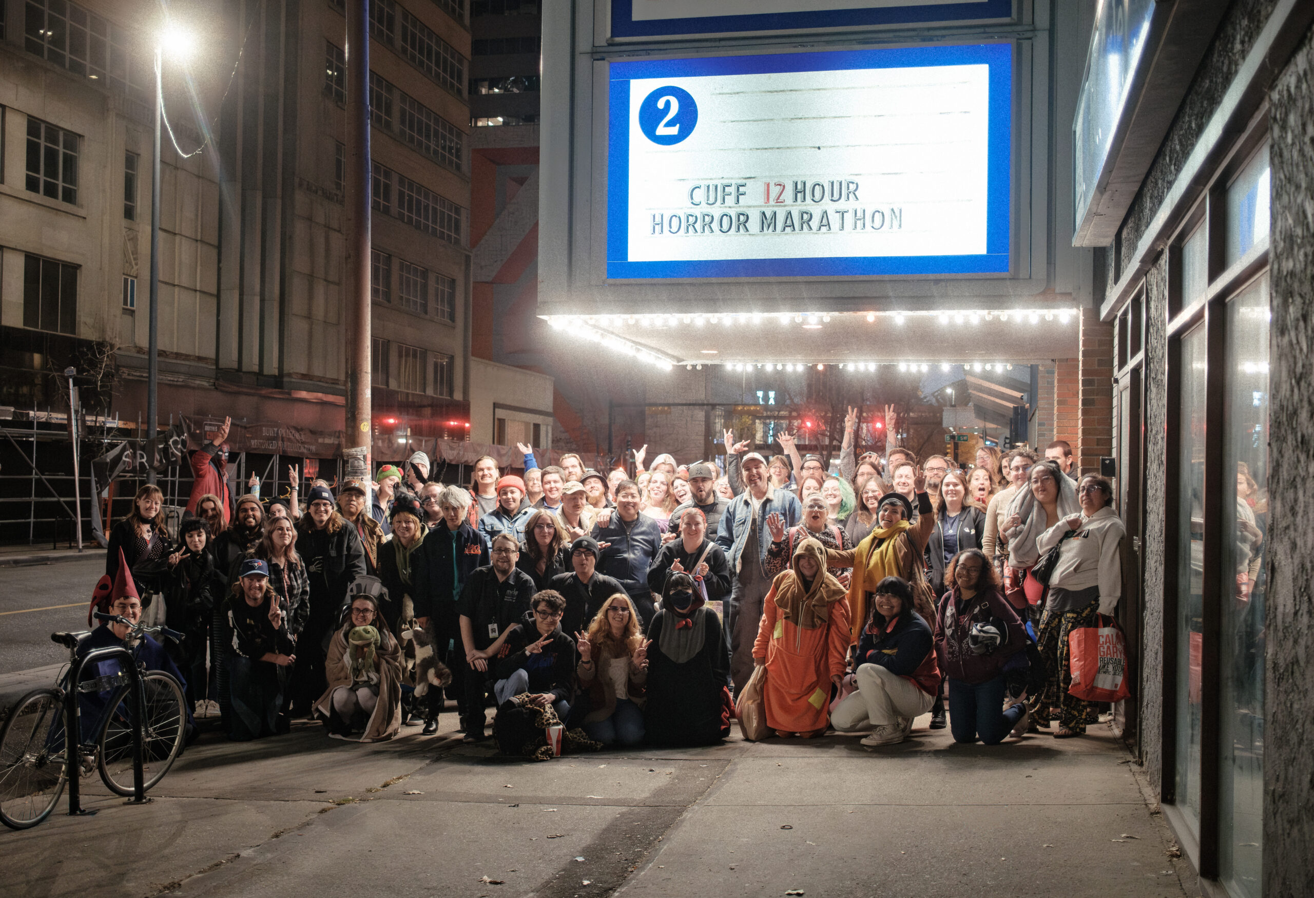 That’s exactly what a massive crowd of horror sickos did on October 25, 2025. the Calgary Underground Film Festival‘s annual 12-Hour Horror Movie Marathon has become a Cowtown Halloween tradition —a 7-to-7, all-night party at Globe Cinema that felt like a slumber party with your best friends, watching VHS tapes your mom wouldn’t approve of. Both the upstairs and downstairs theatres were packed with folks in costume (some standouts include a disco Frankenstein, Bob from One Battle After Another, and Bob and Peggy Hill), clutching pillows for dear life, sipping cold ones and munching endless bags of popcorn. The lobby was bumpin’, with CUFF’s famous hot dog bar going on all night and the fearless Globe concession crew manning the soda machines like a battleship. At around midnight during a costume contest, CUFF employees barged into the lobby with several boxes full of McDonald’s cheeseburgers to revive half-asleep horror fans; in the morning hours, these same heroes came in clutch with a sugary cereal bar. One needs more than Red Bull if they’re gonna make it till 7 a.m.! (Although there was plenty of Red Bull on hand).