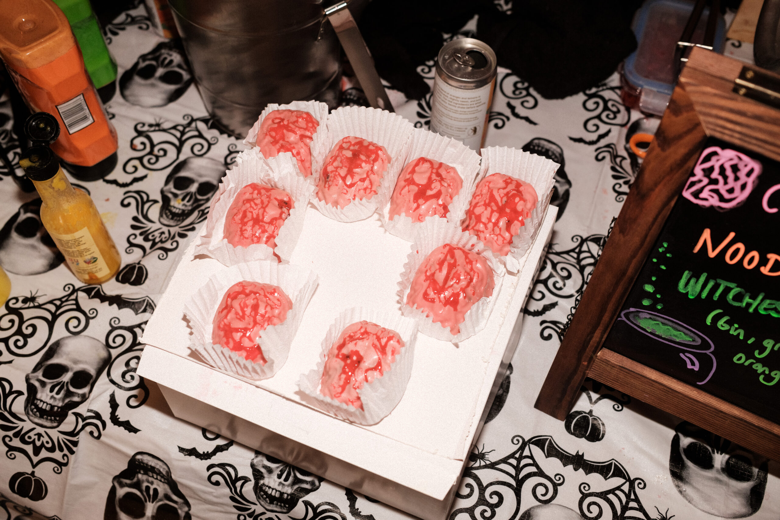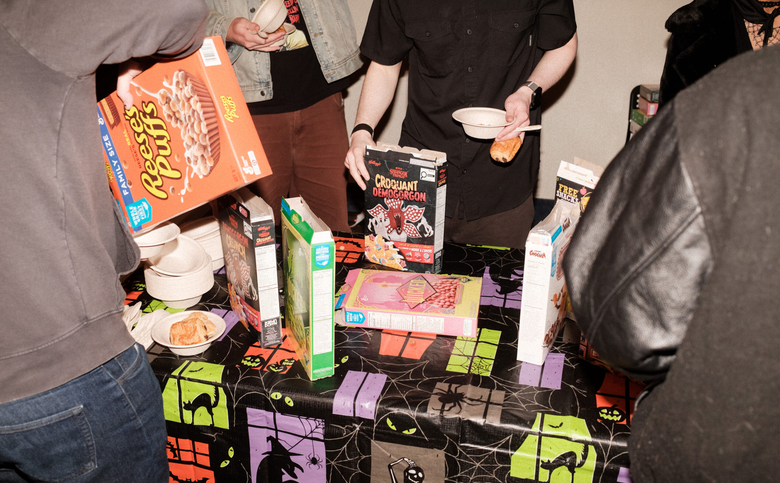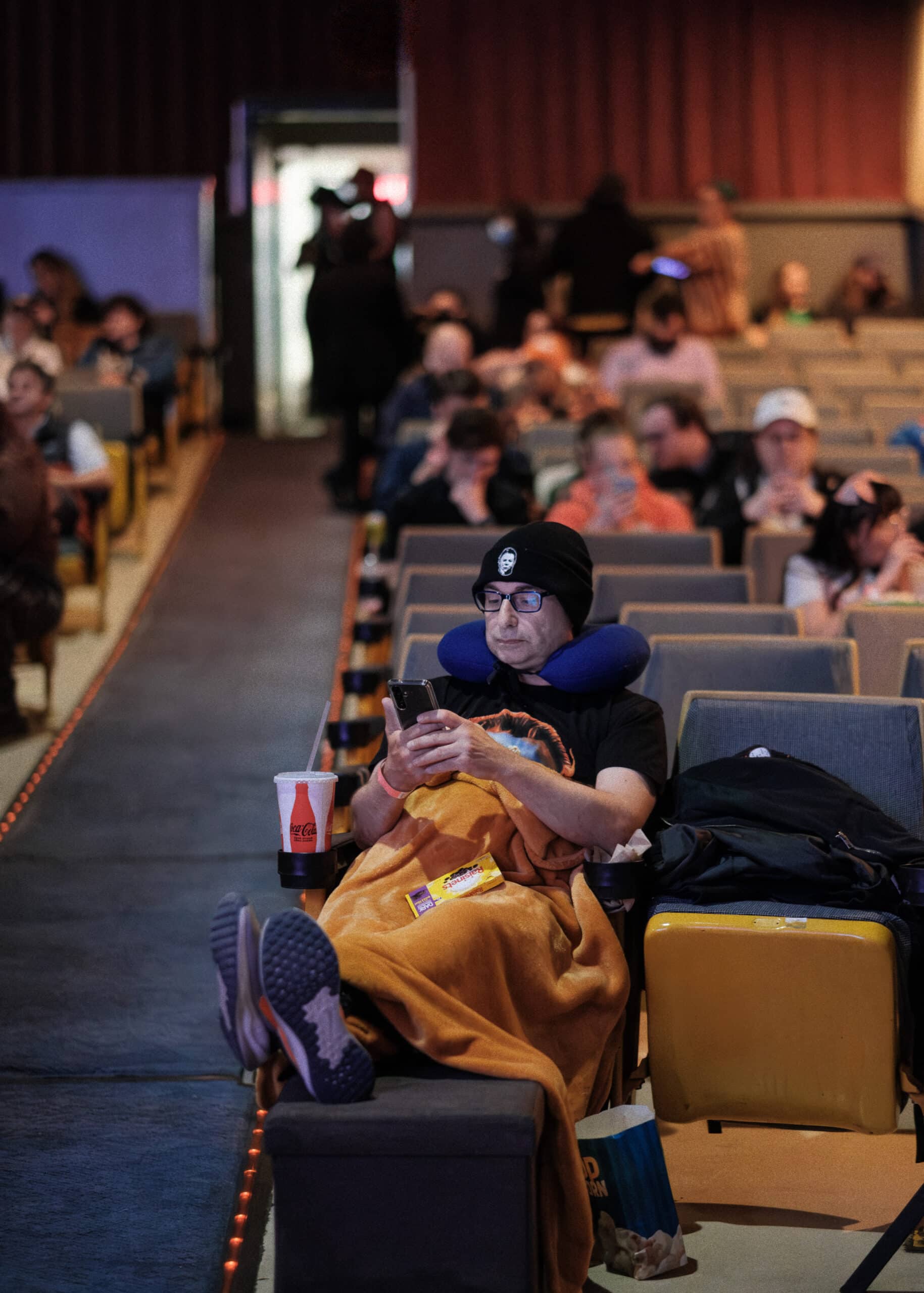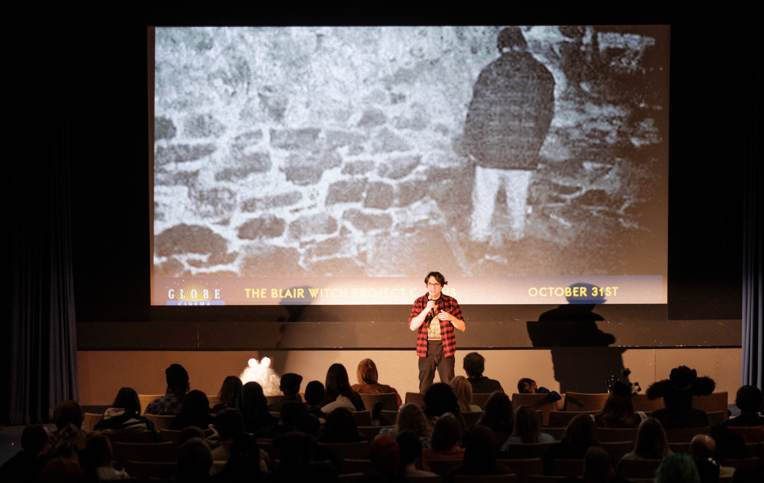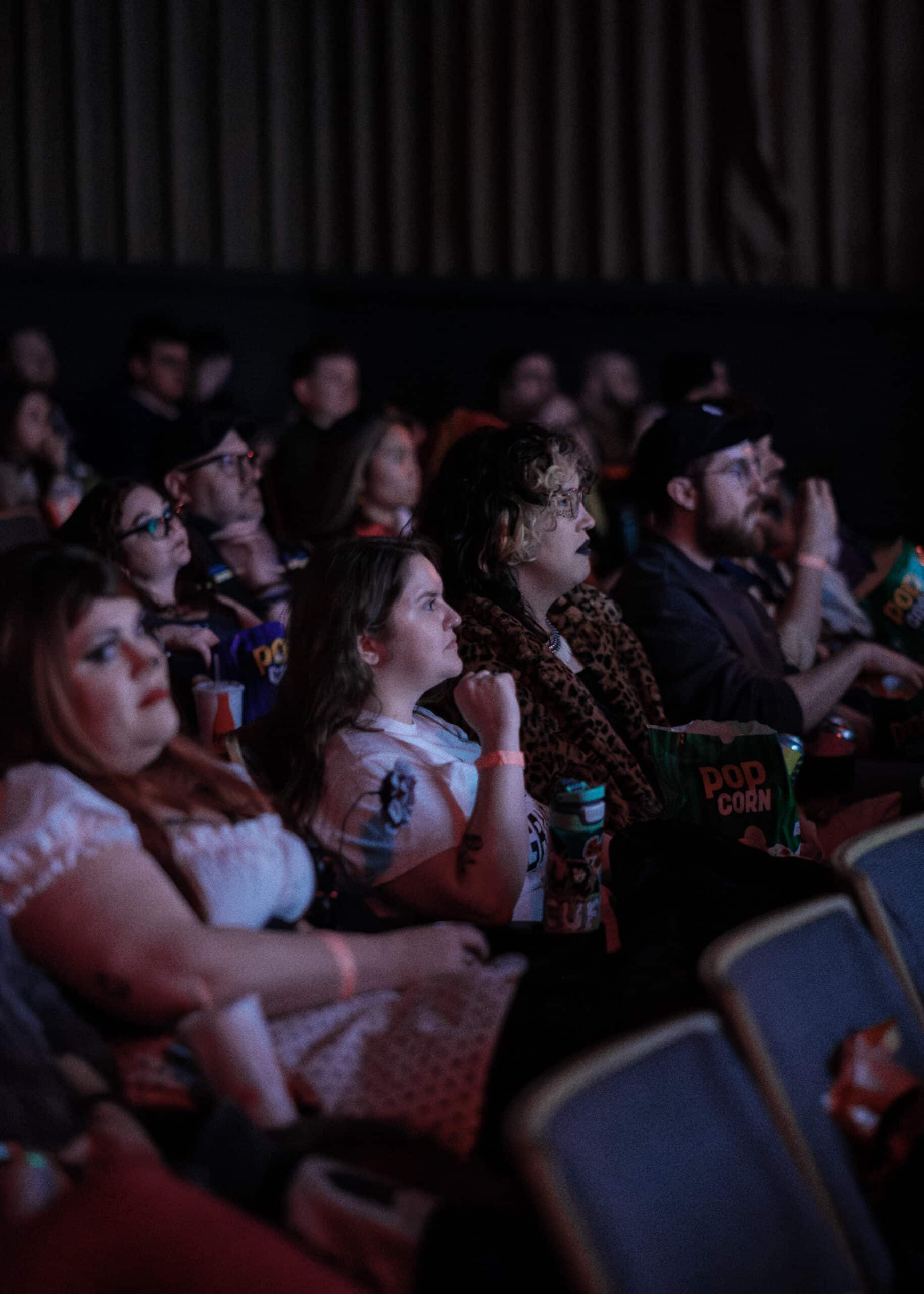 That’s exactly what a massive crowd of horror sickos did on October 25, 2025. the Calgary Underground Film Festival‘s annual 12-Hour Horror Movie Marathon has become a Cowtown Halloween tradition —a 7-to-7, all-night party at Globe Cinema that felt like a slumber party with your best friends, watching VHS tapes your mom wouldn’t approve of. Both the upstairs and downstairs theatres were packed with folks in costume (some standouts include a disco Frankenstein, Bob from One Battle After Another, and Bob and Peggy Hill), clutching pillows for dear life, sipping cold ones and munching endless bags of popcorn. The lobby was bumpin’, with CUFF’s famous hot dog bar going on all night and the fearless Globe concession crew manning the soda machines like a battleship. At around midnight during a costume contest, CUFF employees barged into the lobby with several boxes full of McDonald’s cheeseburgers to revive half-asleep horror fans; in the morning hours, these same heroes came in clutch with a sugary cereal bar. One needs more than Red Bull if they’re gonna make it till 7 a.m.! (Although there was plenty of Red Bull on hand).