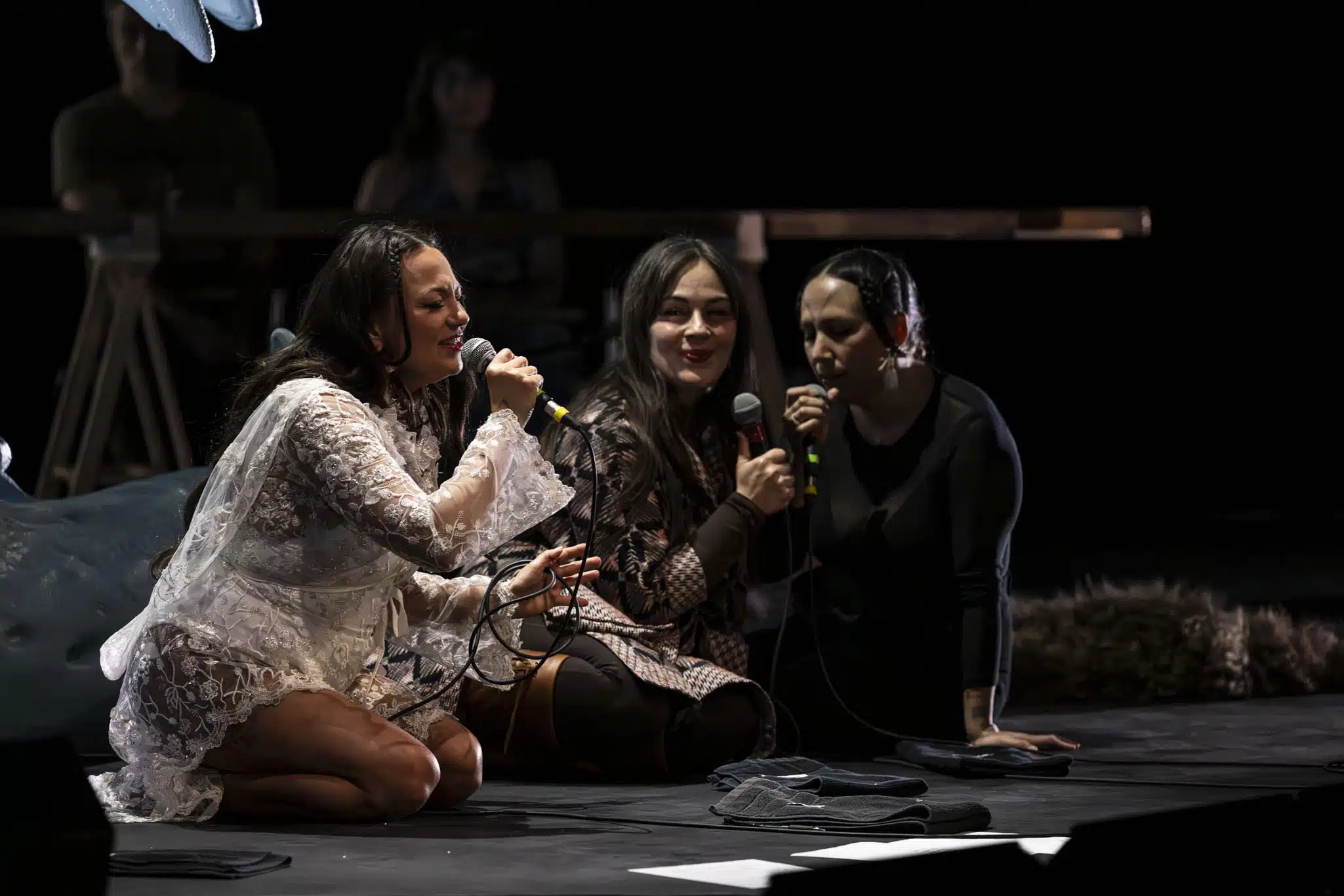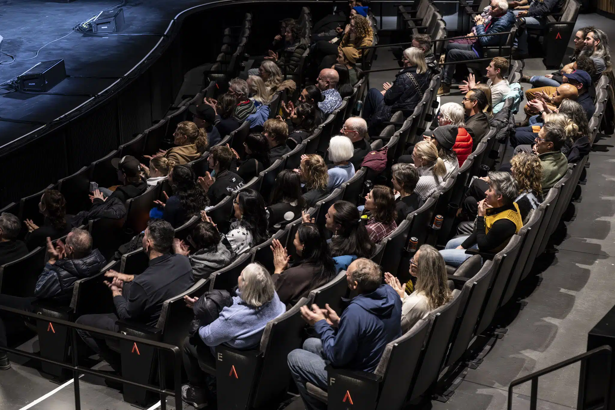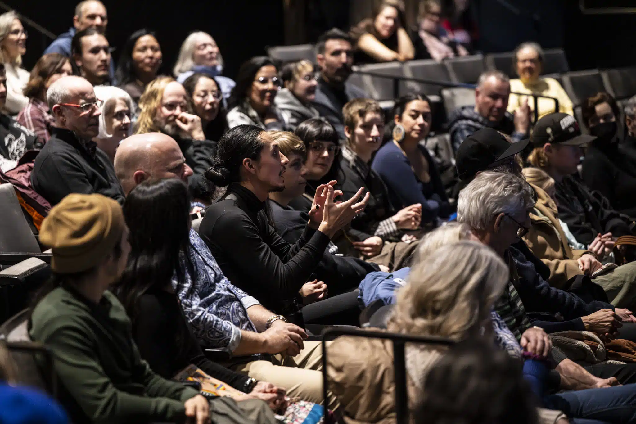 Stepping into the theatre, it was hard not to feel the walls between performer and audience break down. The “open rehearsal” format feels inherently intimate, as does the Jenny Belzberg Theatre, which seemed to swell and shift its walls in relation to the primordial sounds onstage. After a 75-ish minute performance, a lively Q&A hosted by Schaal followed with the creative team, which includes throat-singing duo Silla (Cynthia Pitsiulak and Charlotte Qamaniq) and various family members of Tagaq.