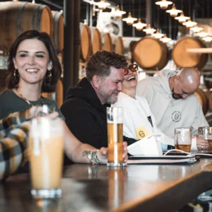 As for the taproom itself? Think “warm and low-key.” The lighting is warm, the seating is assorted, and the bar that dominates the room is always staffed with smiling beer slingers. Barrels hang towards the back of the room near the exposed distilling equipment in the back, making you feel like you’re a part of the brewing process yourself. If you visit near a holiday, you might even see some decorations hanging off of those barrels, like spiderwebs during Halloween time … or perhaps something more festive.
